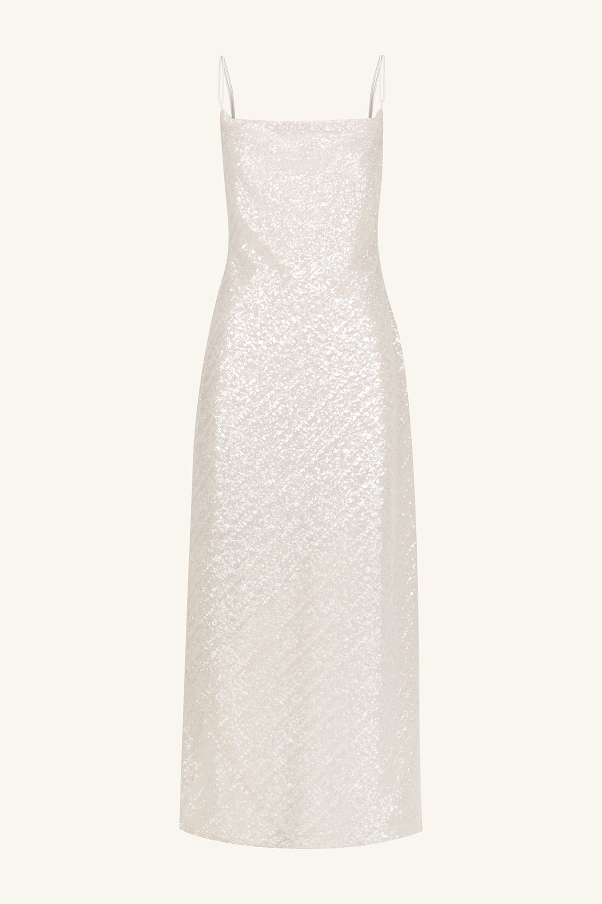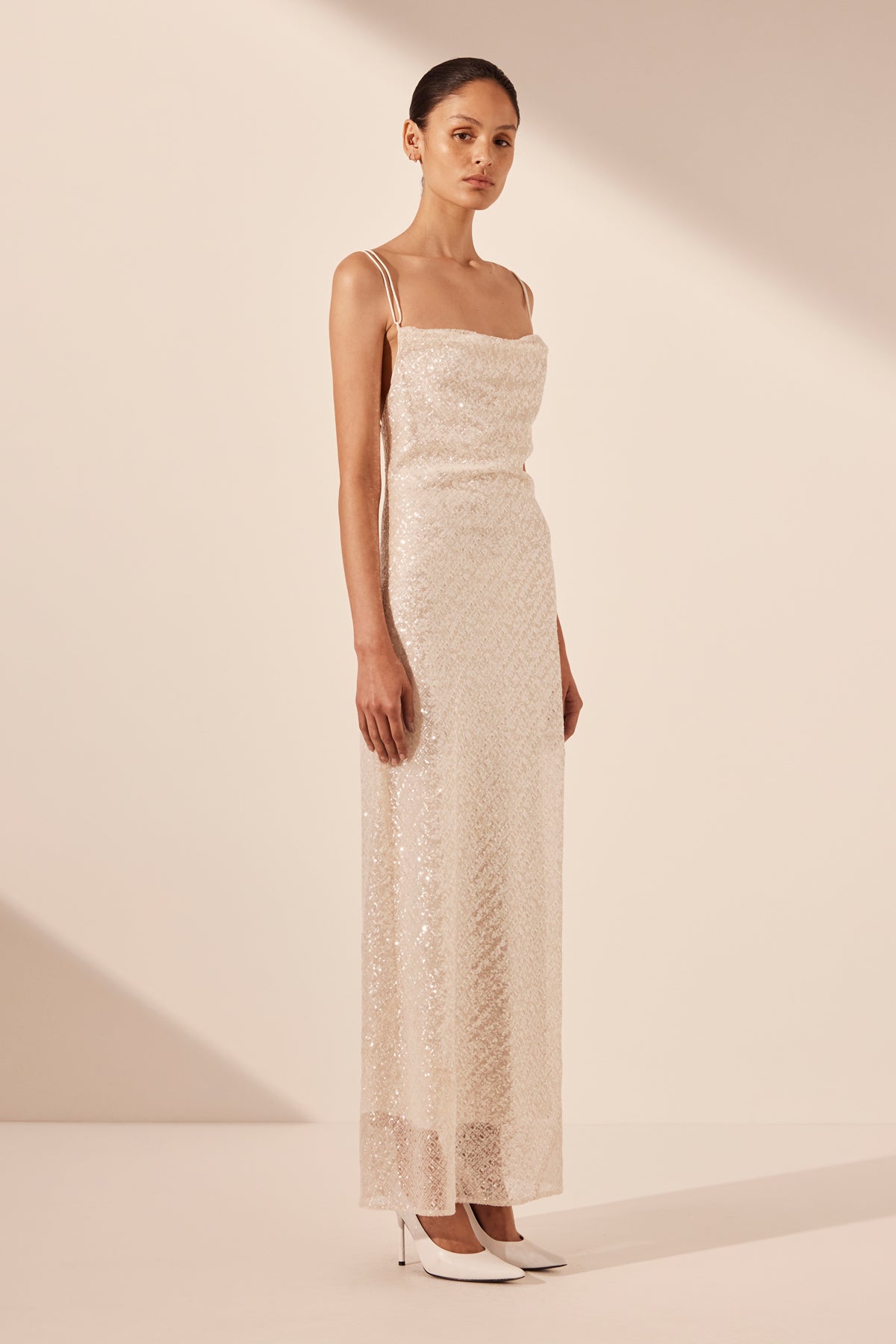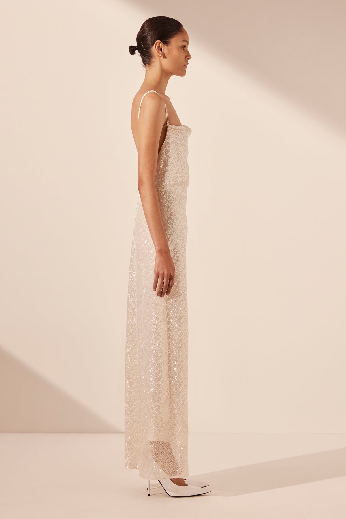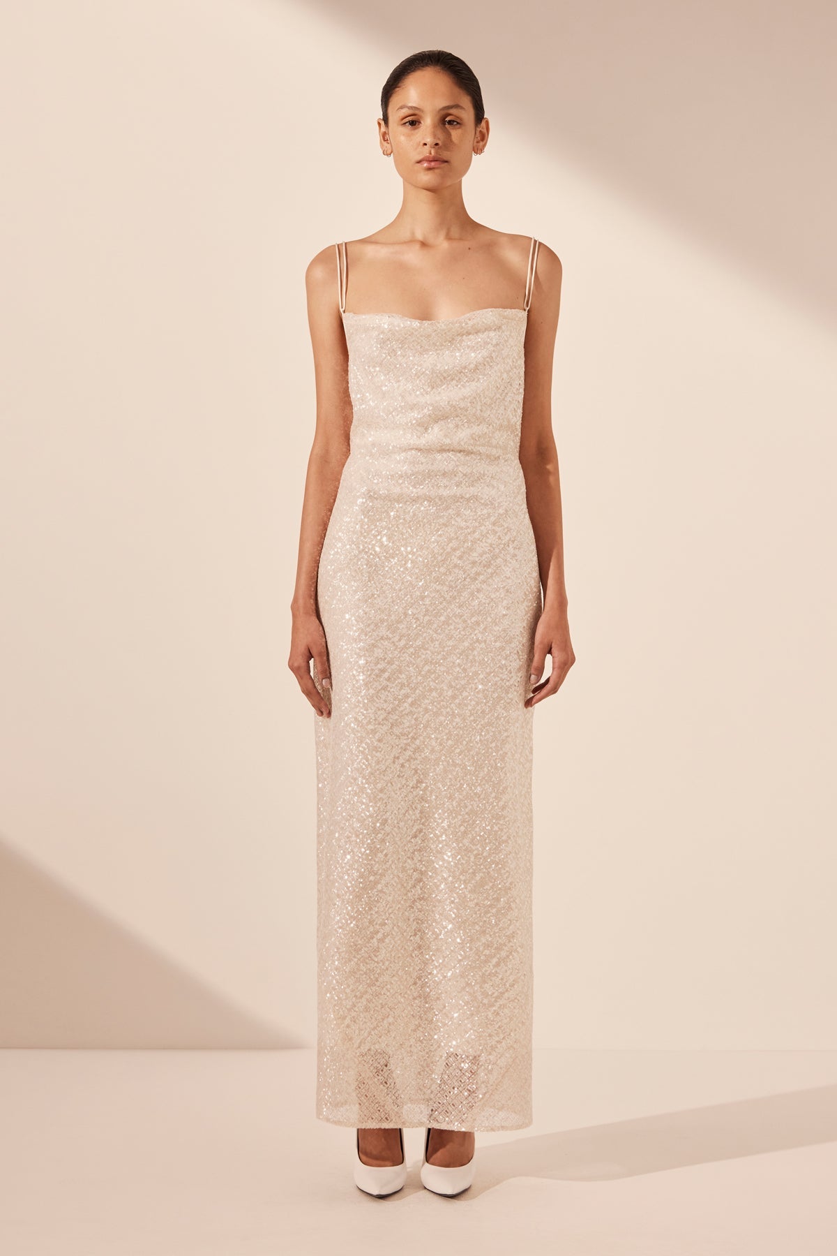 Cowl maxi dress with open back in a sequin embellished mesh.