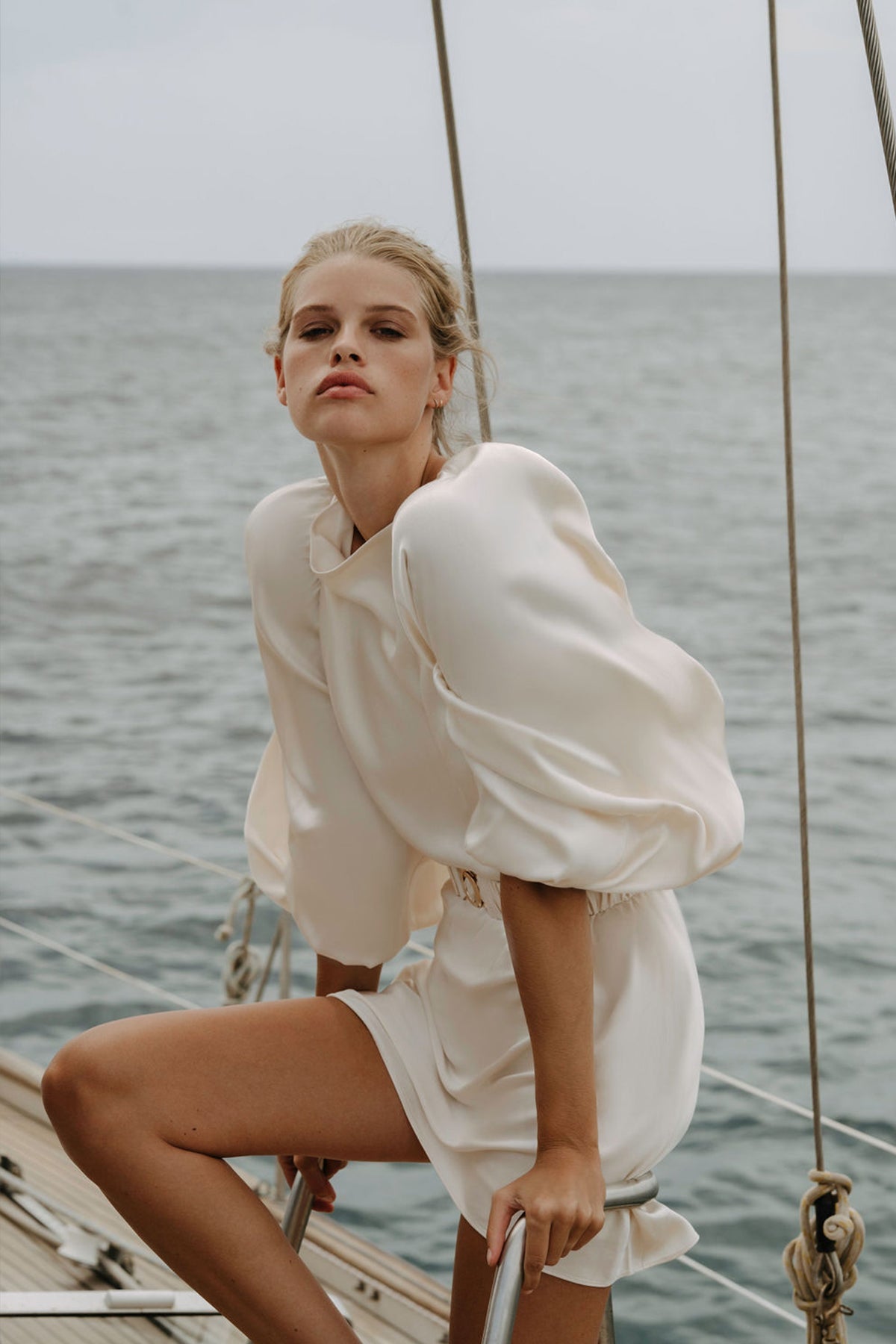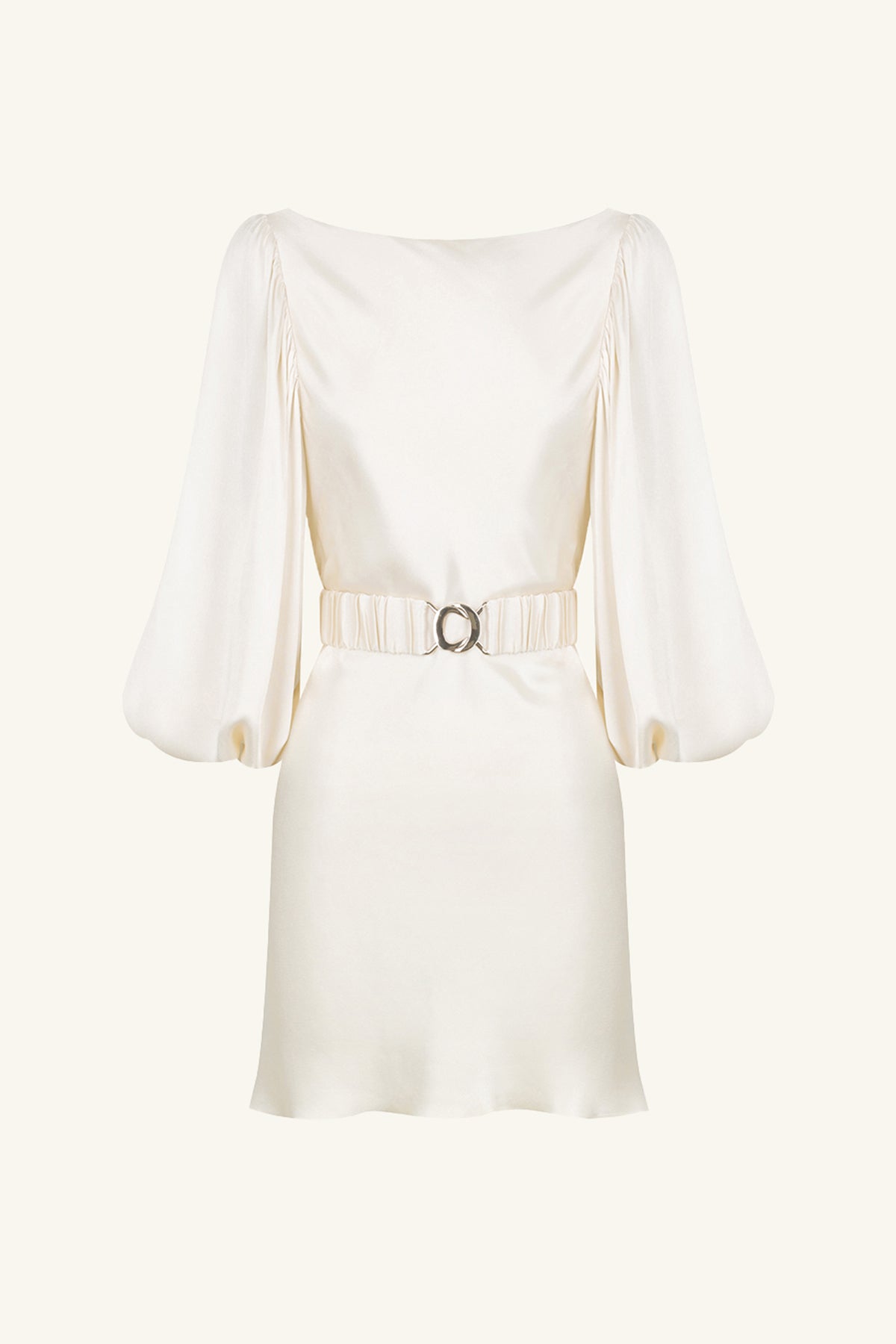 Balloon sleeve mini dress with low back in cream in a LENZING? ECOVERO? with luxurious satin finish.
