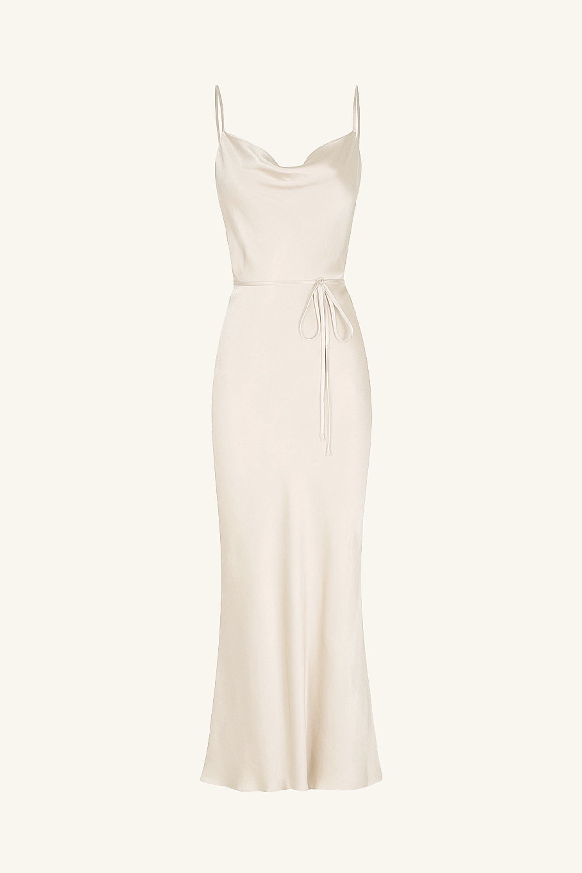 Bias cowl midi dress in cream in a LENZING? ECOVERO? with luxurious satin finish.