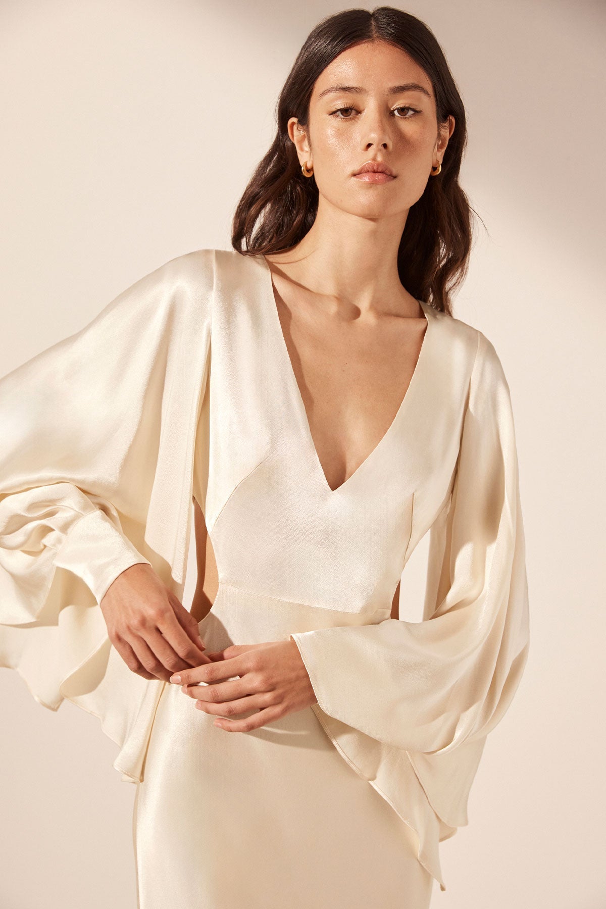 Flared sleeve maxi dress with cut out side detail in a LENZING? ECOVERO? with luxurious satin finish.