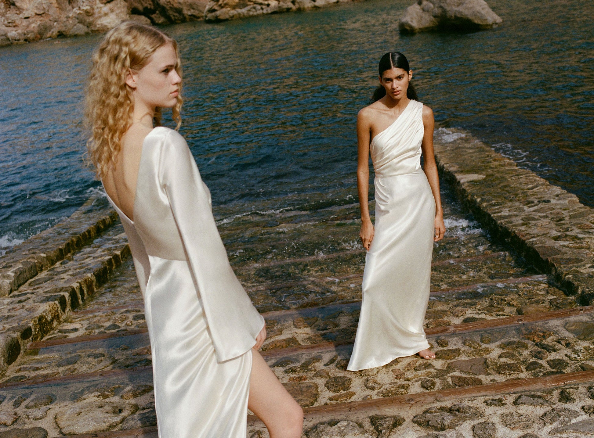 Flared sleeve midi dress in cream in a LENZING? ECOVERO? with luxurious satin finish.