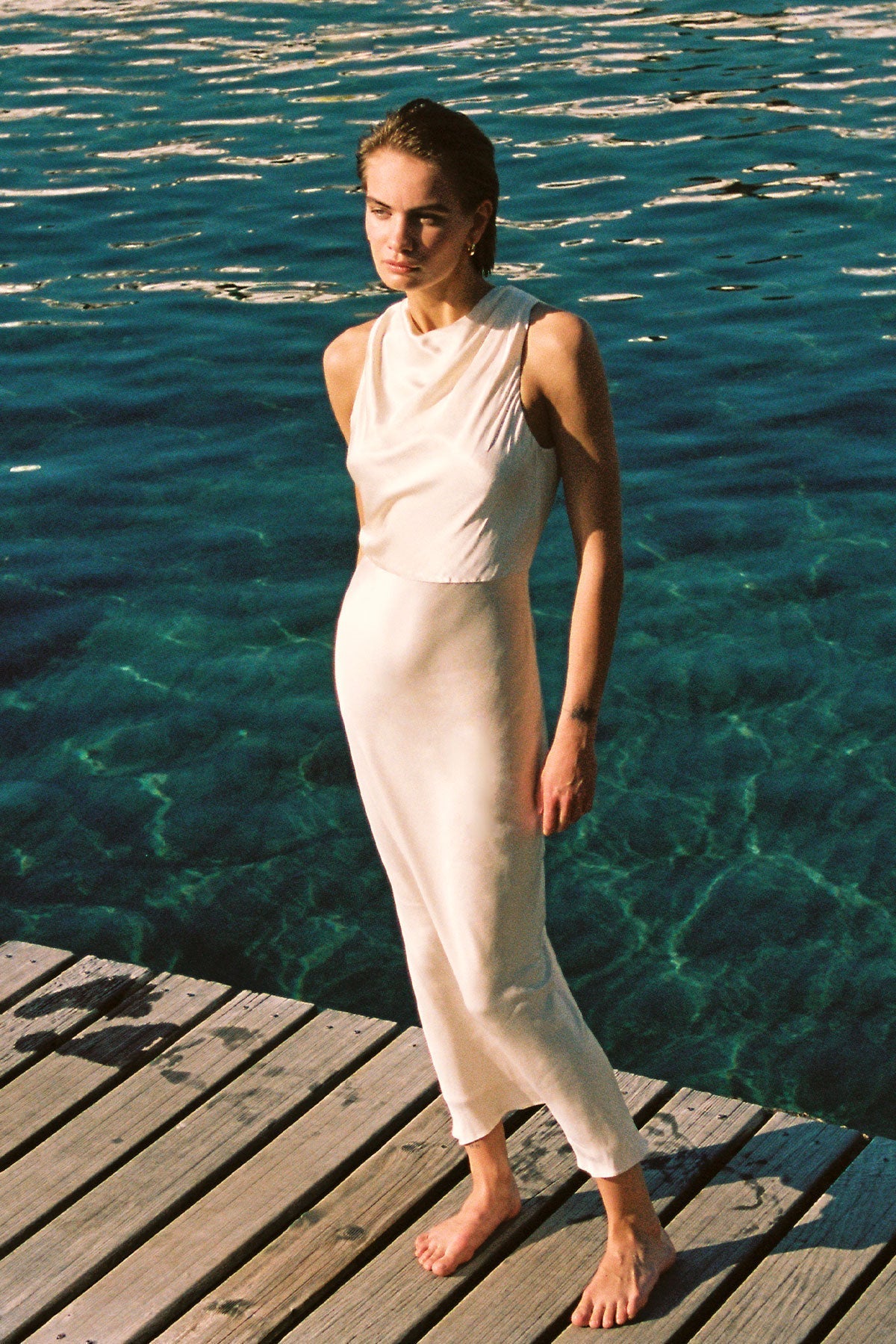 High neck maxi dress in a LENZING? ECOVERO? with luxurious satin finish.