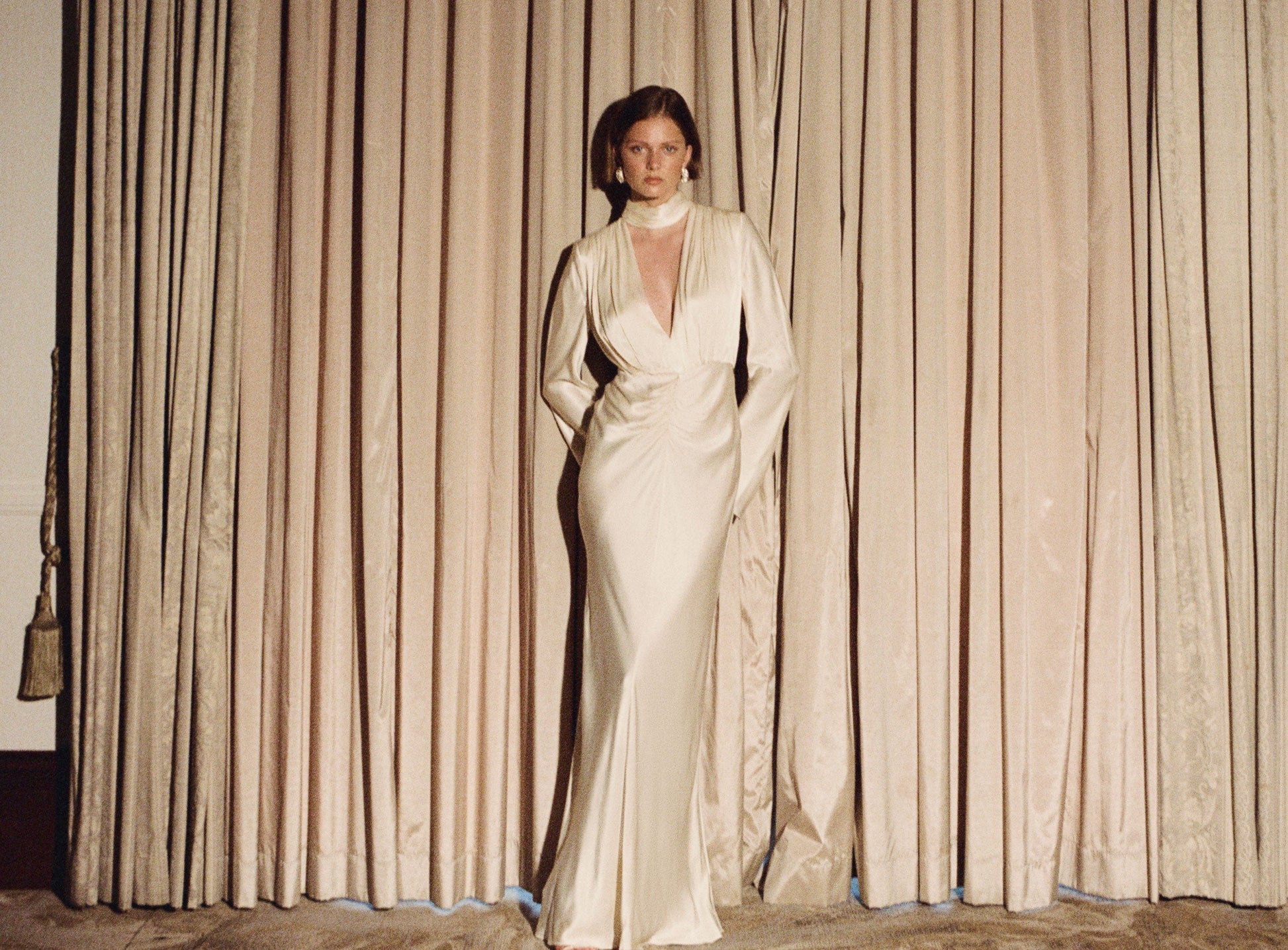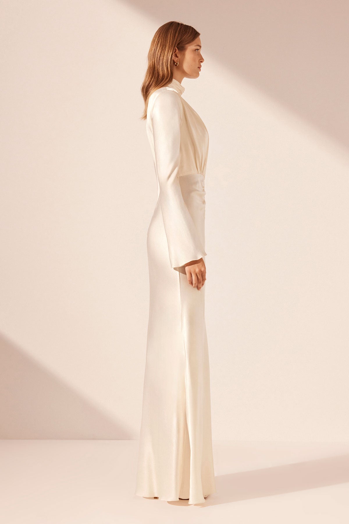 Plunged long sleeve maxi dress in cream in a LENZING ECOVERO with a luxurious satin finish.