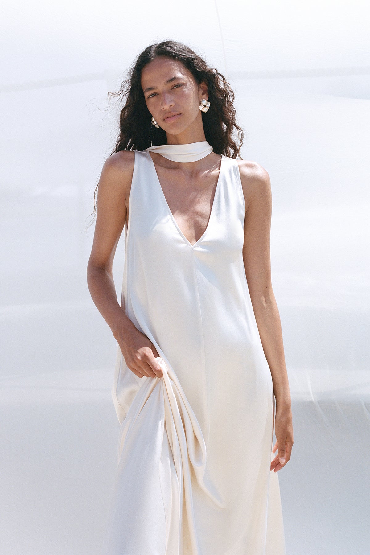 Plunged maxi dress with scarf in cream in a LENZING ECOVERO with luxurious satin finish.