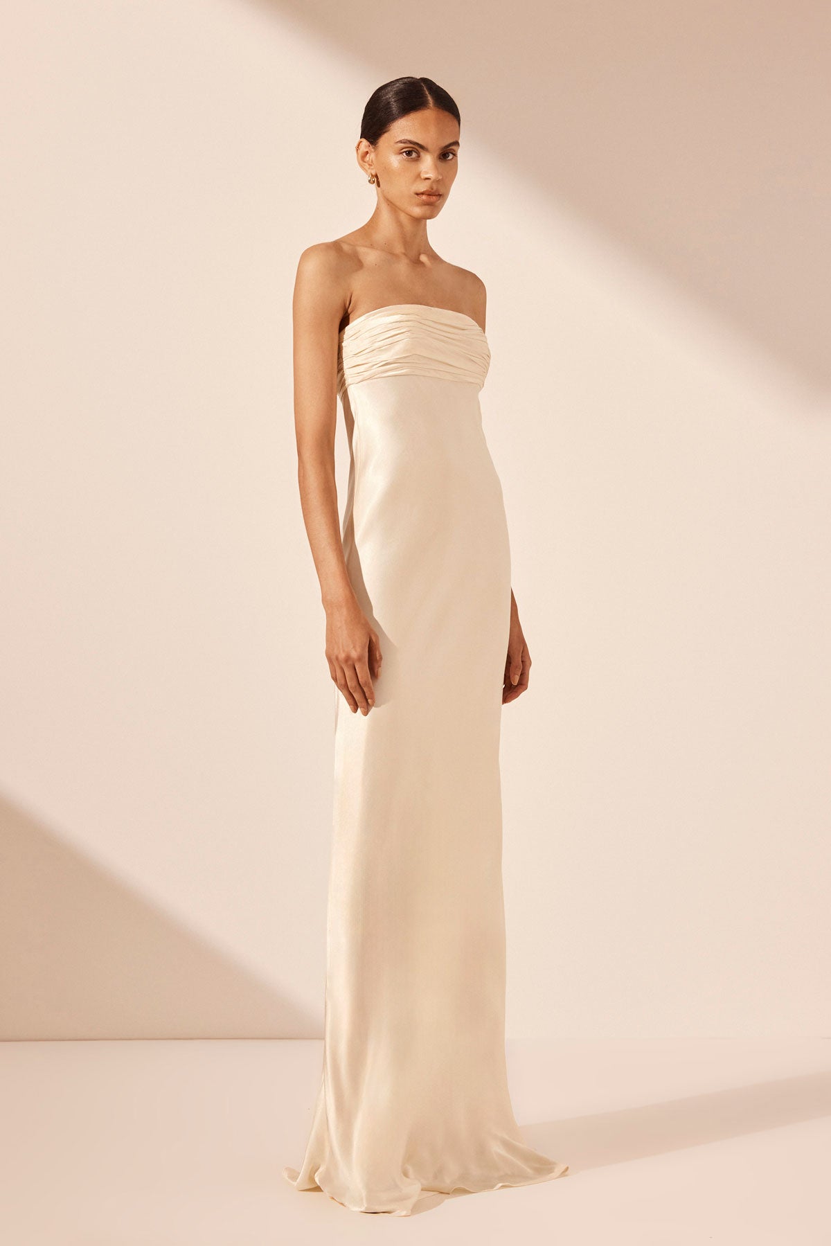 Strapless maxi dress with ruched bodice detail in cream in a LENZING? ECOVERO? with luxurious satin finish.