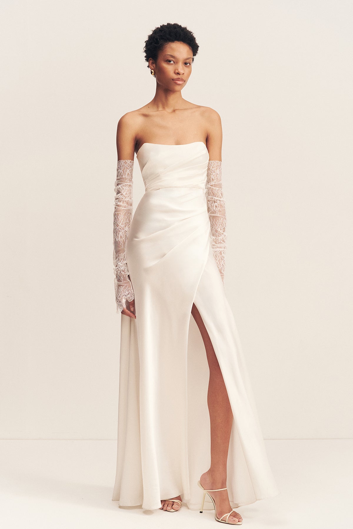An elegant glove featuring sheer lace with a scalloped edge in ivory for an elegant finish.