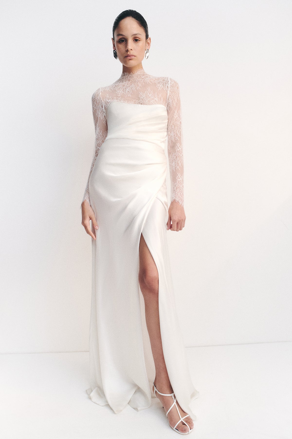 Sheer lace bodysuit with a high scalloped neckline and elegant long sleeves, perfect as a layering piece to elevate your bridal look with timeless romance and modern sophistication.