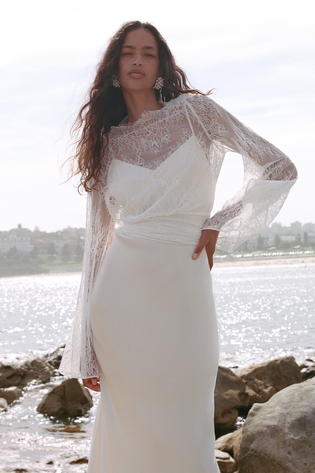 Sheer lace top with a high scalloped neckline and long, flared sleeves, designed for versatile styling options.