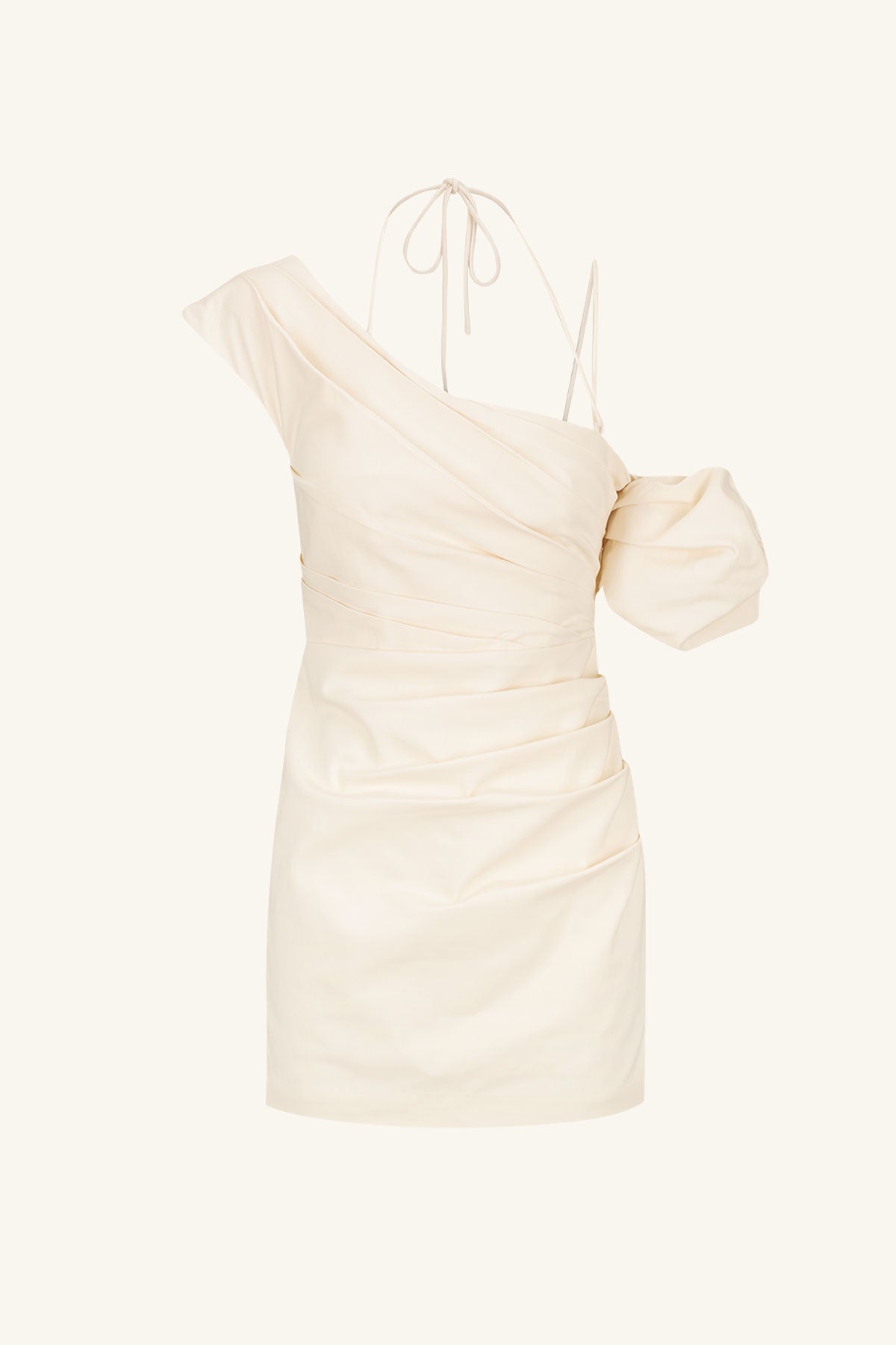Asymmetrical draped mini dress with tie detail in rice in a premium stretch cotton blend.