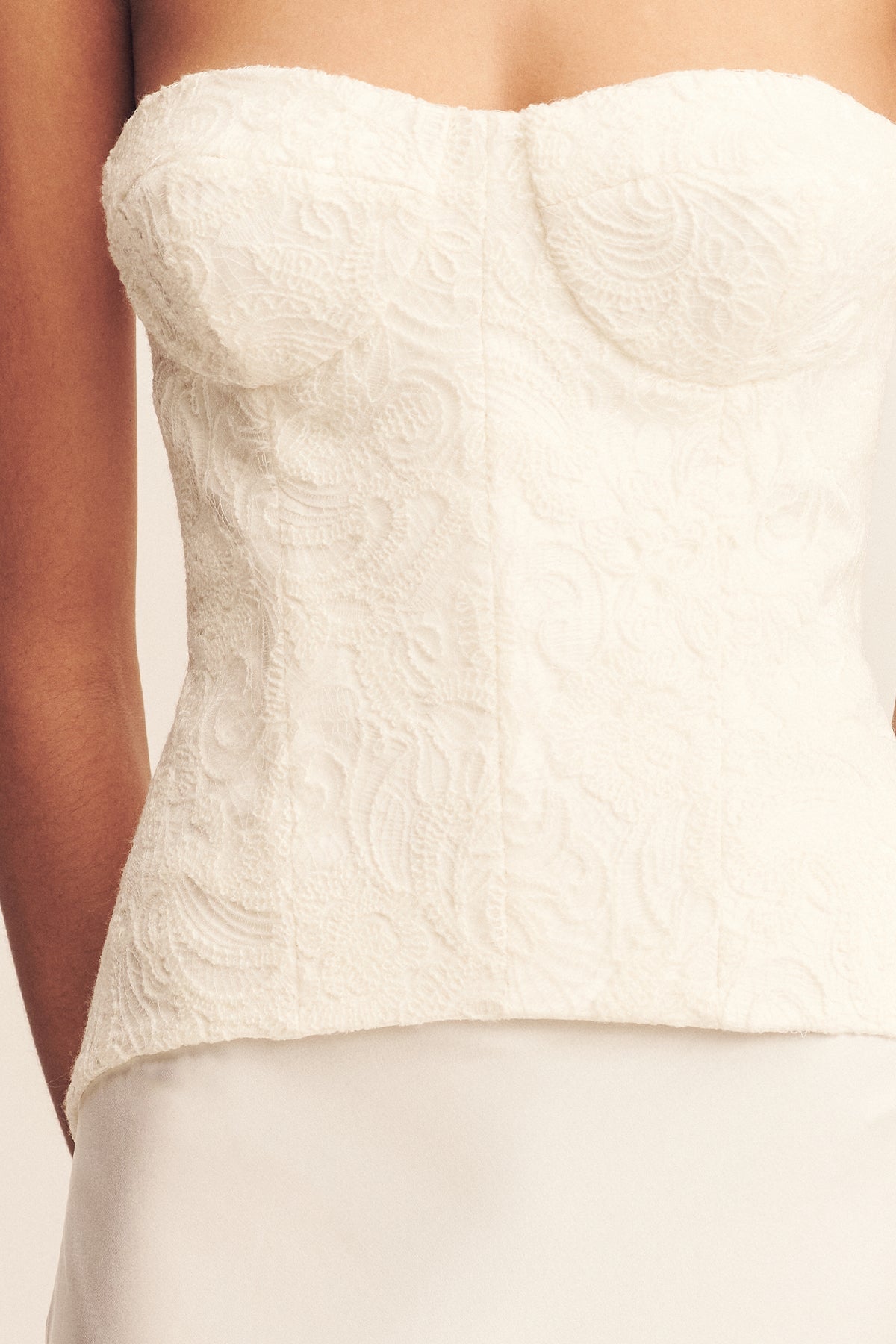 Strapless bustier in ivory in a textured embroidered lace.