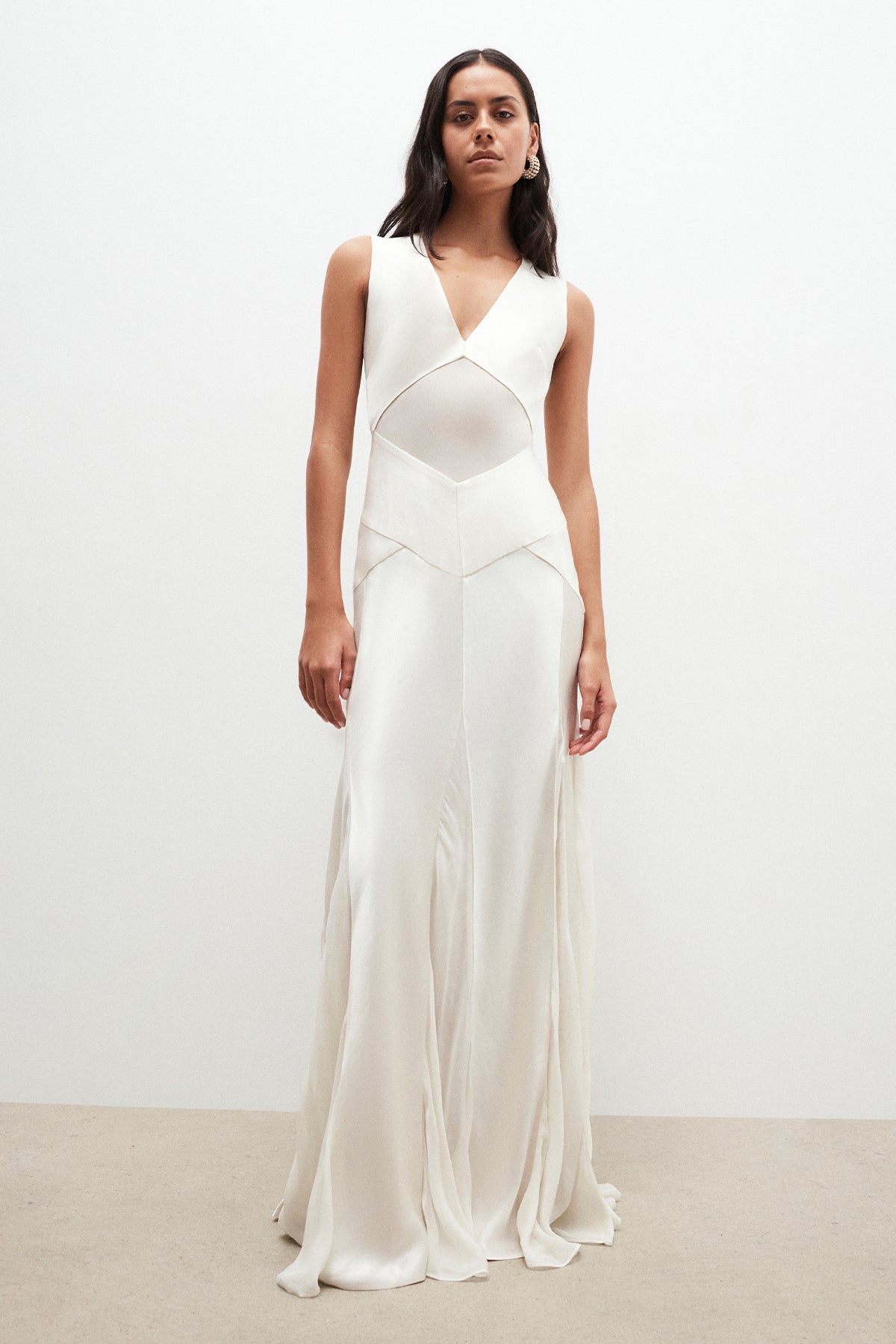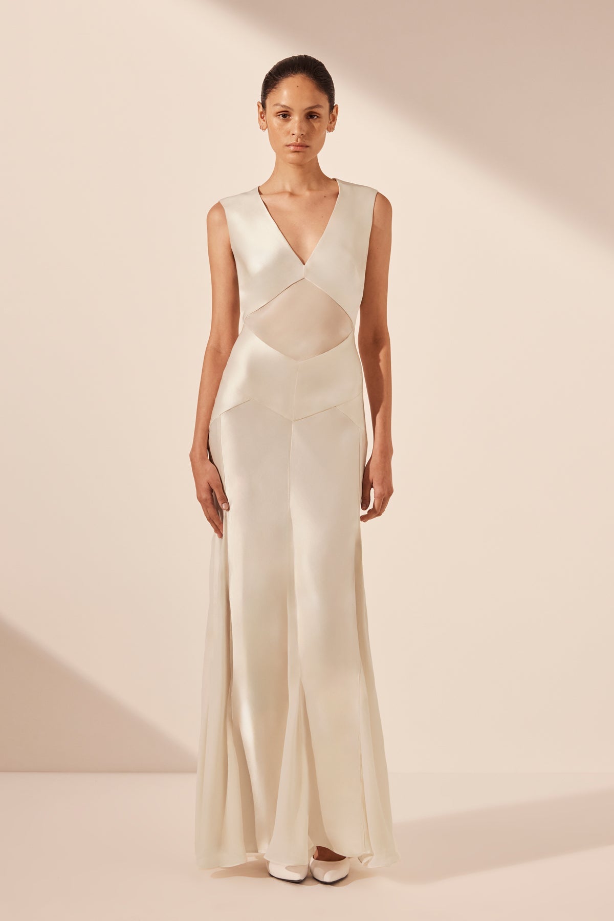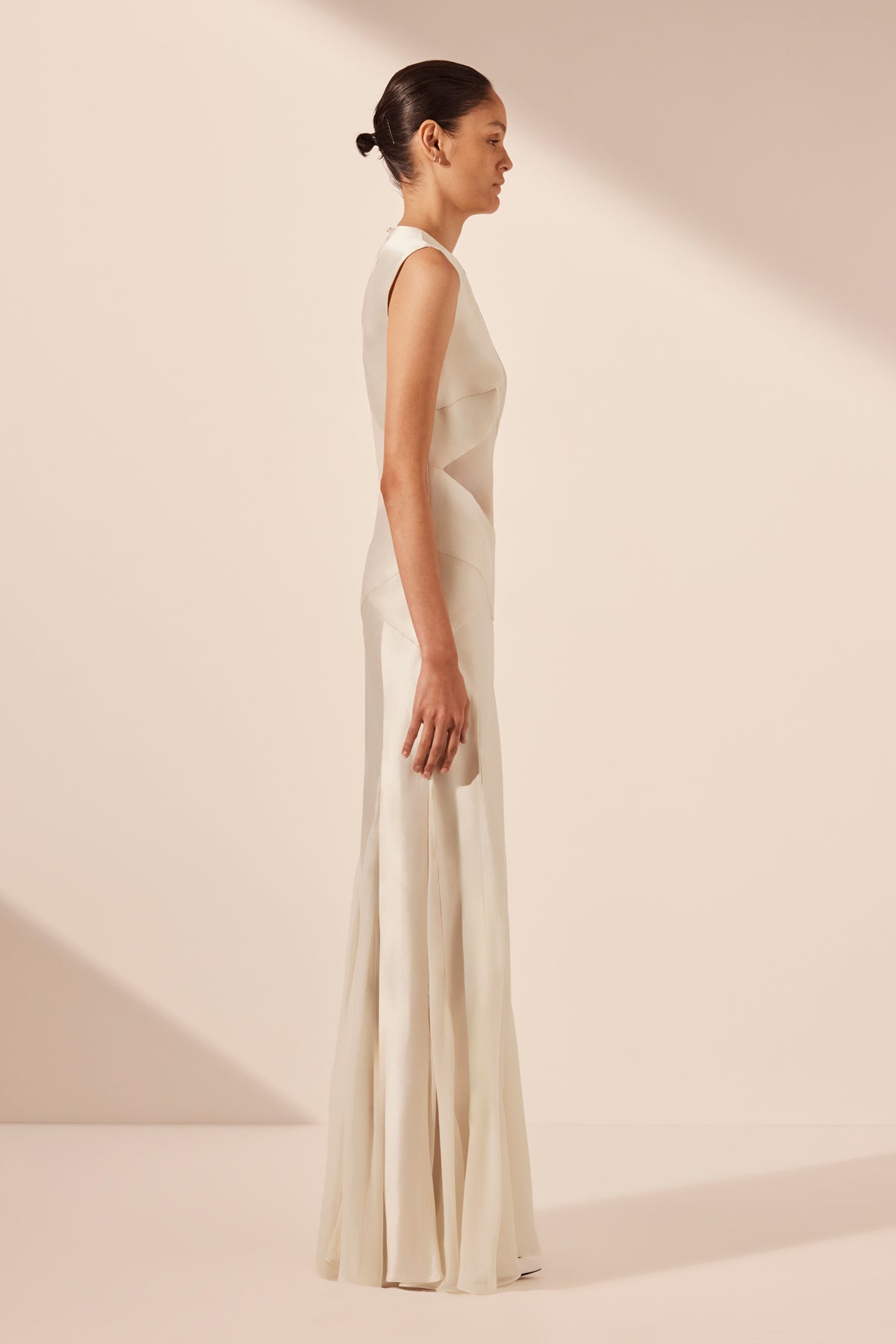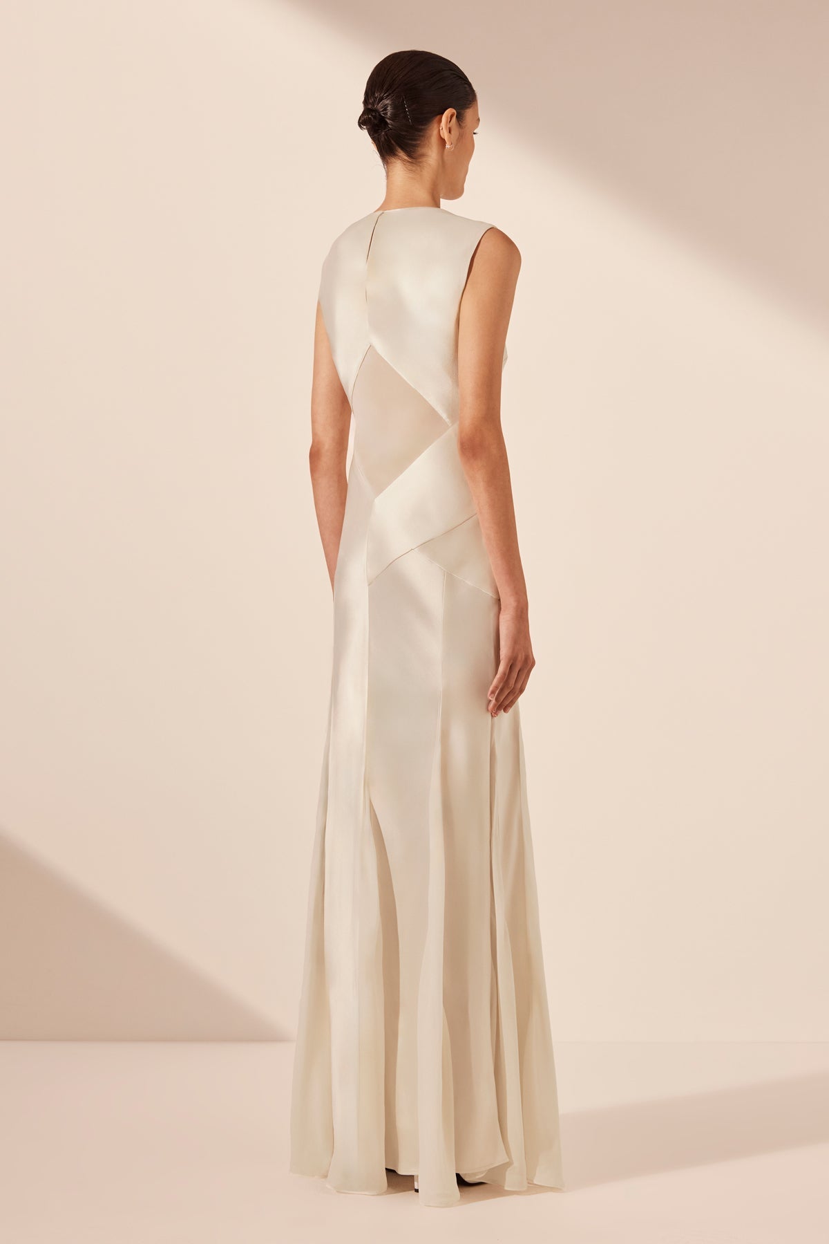 Godet Maxi dress in pearl in a luxurious satin acetate contrasted with a light weight semi-sheer georgette.