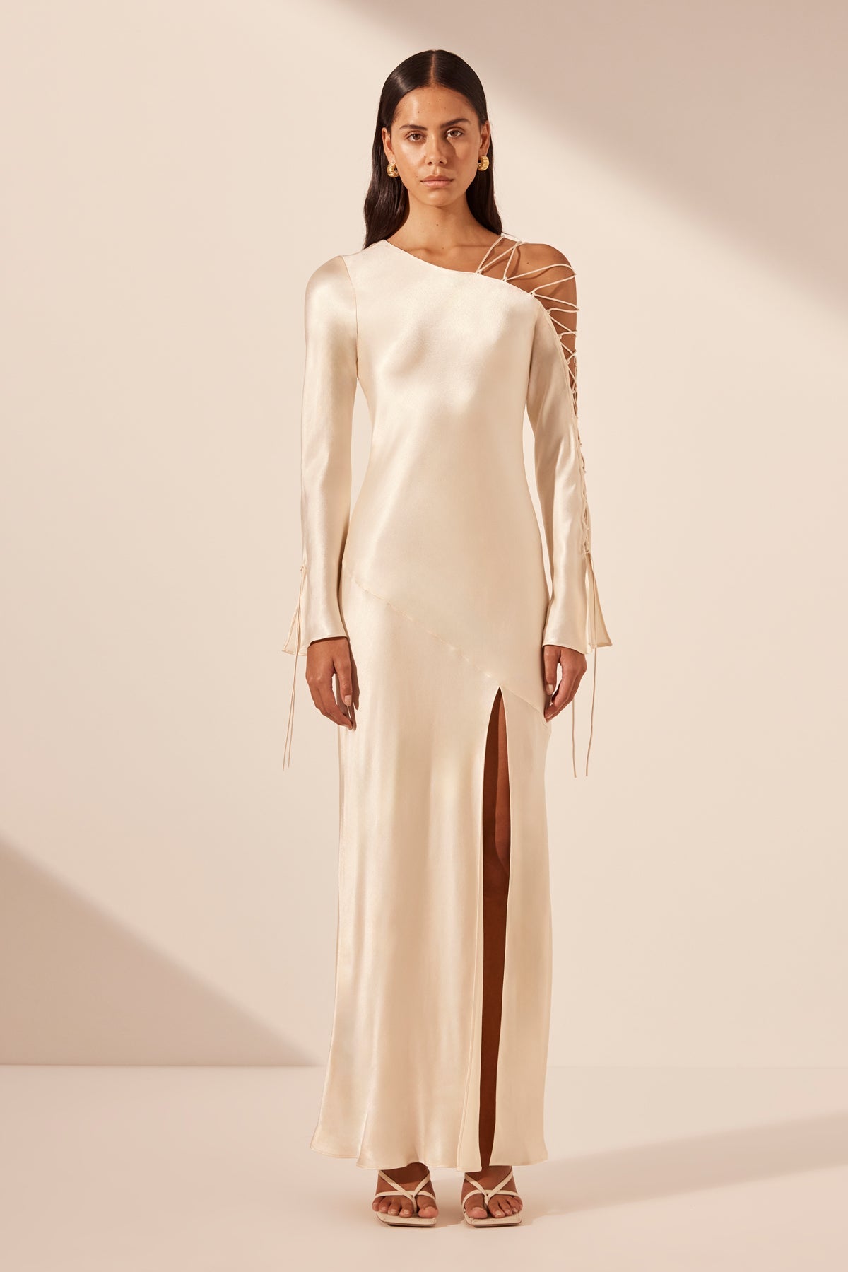 Long sleeve maxi dress with asymmetrical lace up detailing in cream in a LENZING? ECOVERO? with luxurious satin finish.