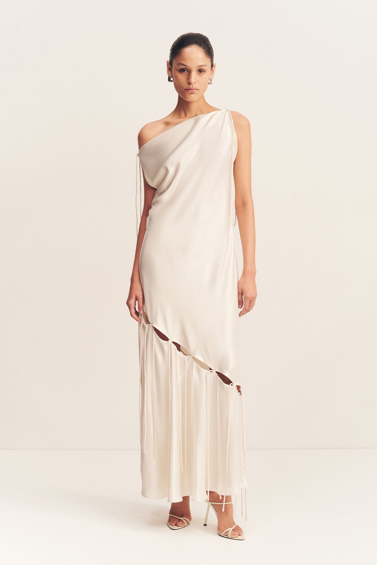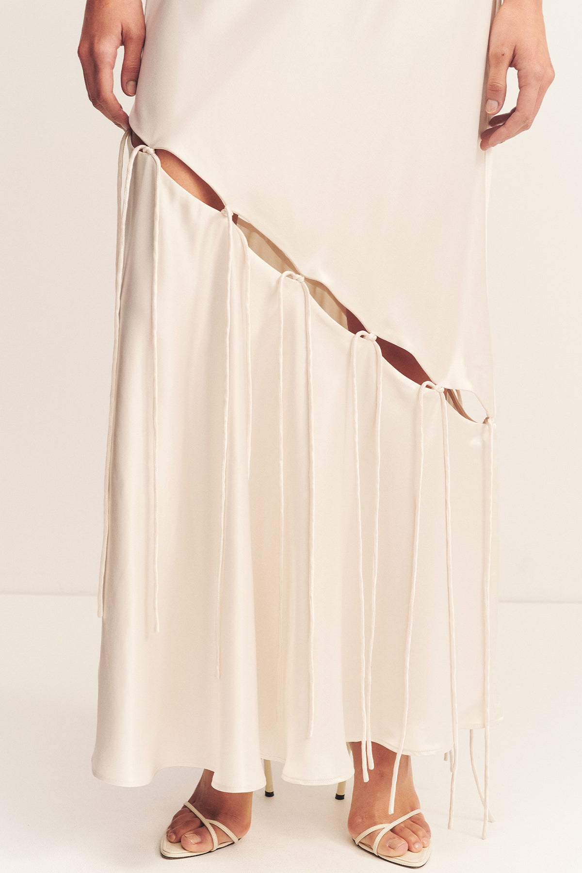 Tie maxi dress with asymmetrical cut out tie details in ivory in a luxurious satin acetate.