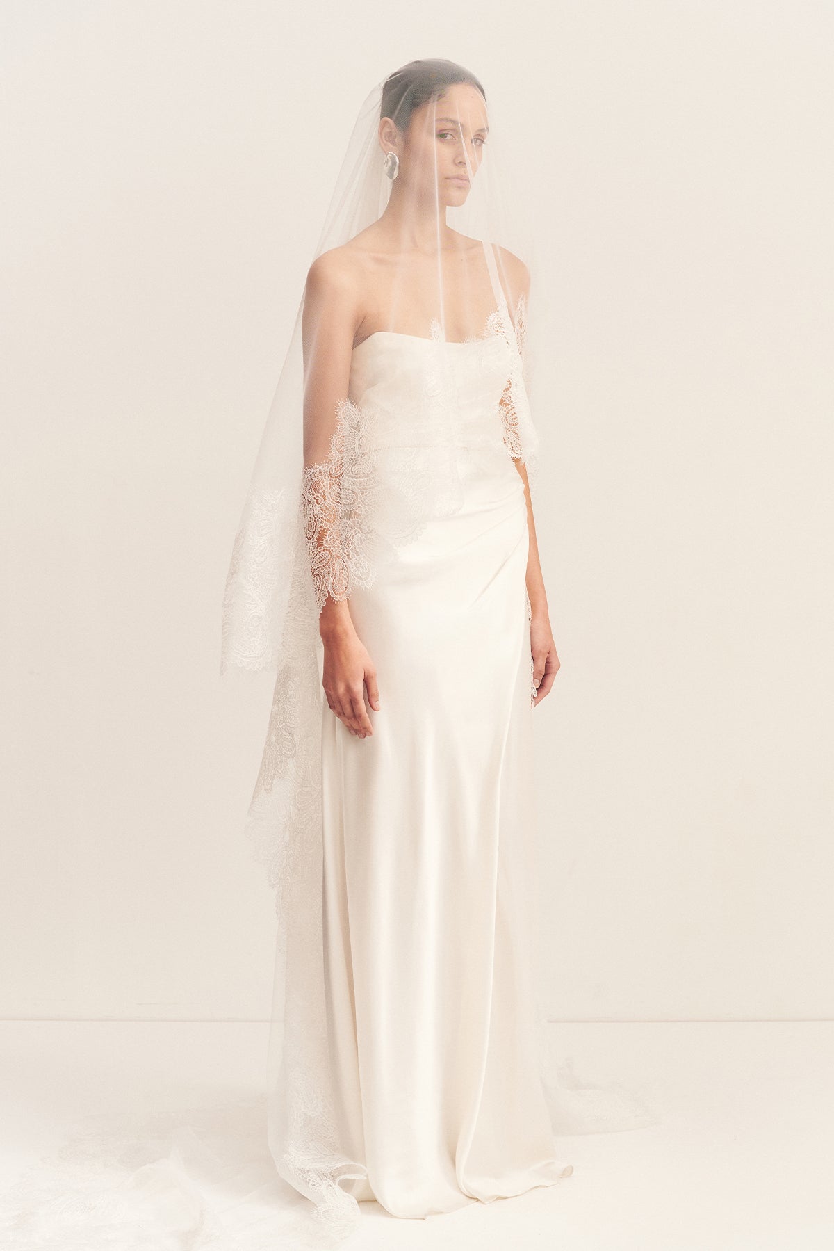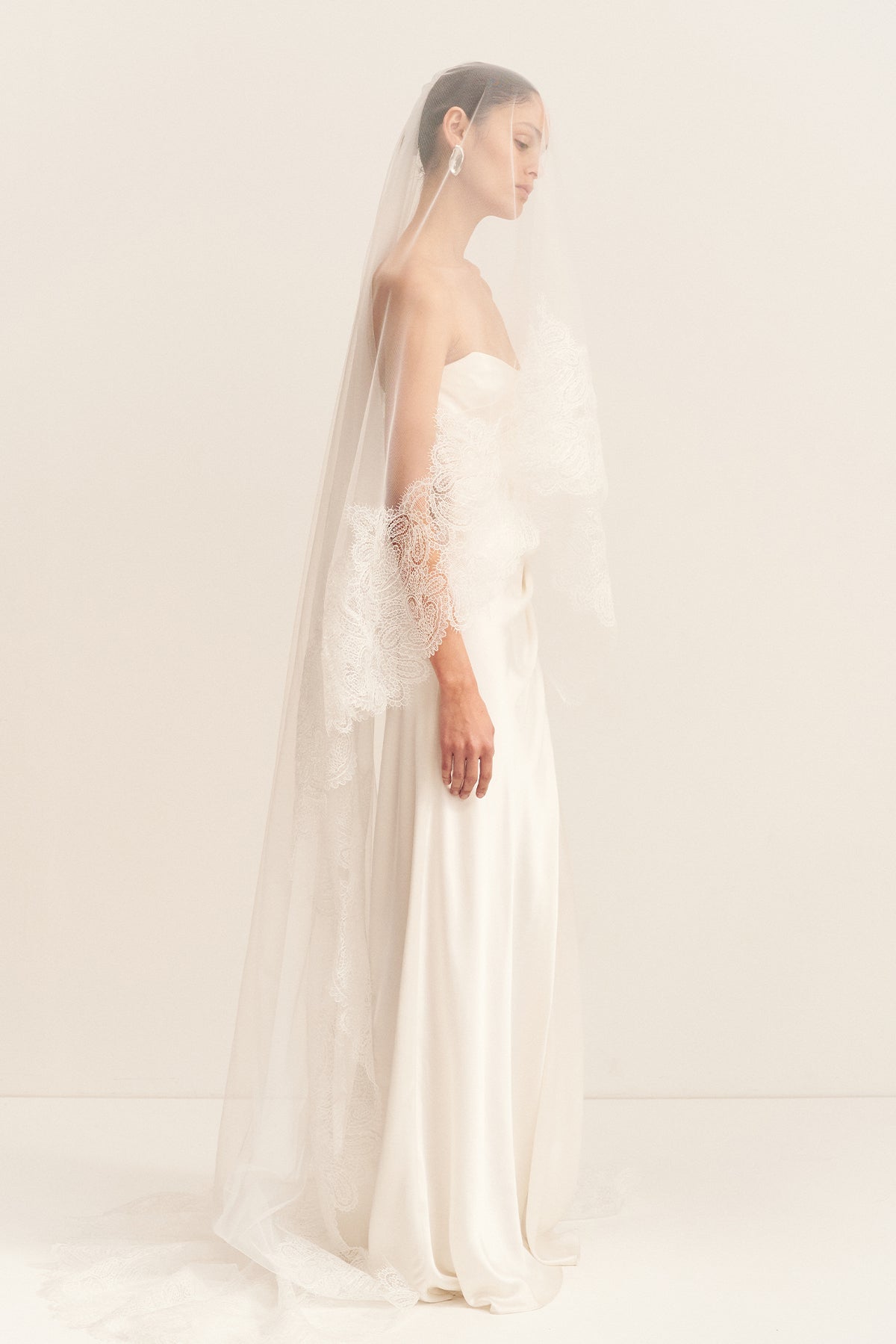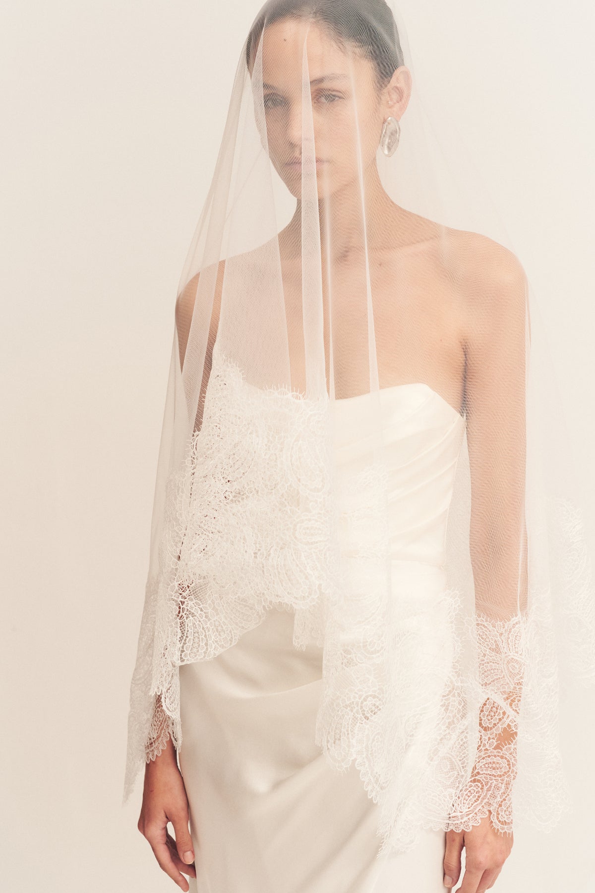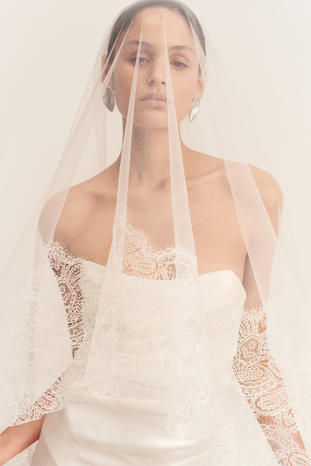 A delicate cathedral veil with a soft tulle fabric, featuring an elegant lace border and a charming blusher for a touch of classic romance.
